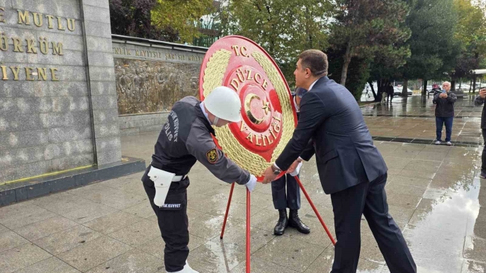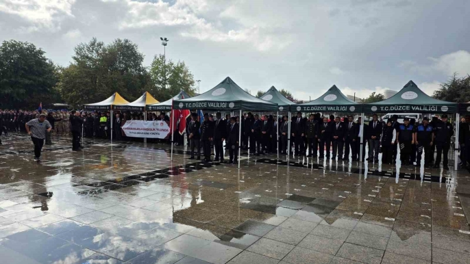 Anıtpark'ta Atatürk Anıtı'na çelenk sunuldu, saygı duruşunda bulunuldu ve İstiklal Marşı okundu. Türkiye Muharip Gaziler Derneği Düzce Şube Başkanı Lütfü Bulut günün anlam ve önemini vurgulayan bir konuşma yaptı ve birlik beraberlik mesajı verdi. Konuşmanın ardından Beyköy İmam Hatip Ortaokulu öğrencisi Elif Naz Özkurt, 'Bu vatan kimin' şiirini okudu. Tören, şiir okumasının ardından sona erdi.