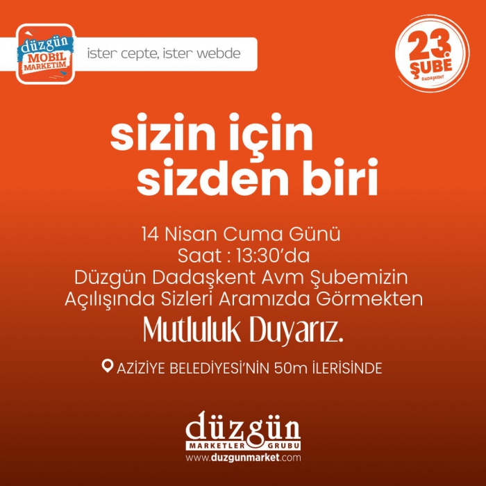 Perakende sektörünün Erzurum’daki yüz akı markası olan Düzgün Marketler Grubu, yeni bir yatırımın daha kapılarını açıyor. Düzgün Marketler Grubu’nun en büyük alışveriş mağazası, 14 Nisan Cuma günü Dadaşkent’te açılıyor. Erzurum'un milli sermayedeki gururu Düzgün Market, AVM konseptindeki 23’ncü ve en büyük şubesini 14 Nisan Cuma günü Dadaşkent'te hizmete açıyor. Erzurum'da yeni bir yatırıma imza atmanın gururunu ve mutluluğunu yaşadıklarını belirten Düzgün marketler Grubu Yönetim Kurulu Başkanı Ömer Düzgün, ''Bu yeni şubemizde, müşterilerimize daha geniş bir ürün yelpazesi sunacak ve bölgedeki müşterilerimize daha fazla hizmet vermemizi sağlayacak'' dedi.