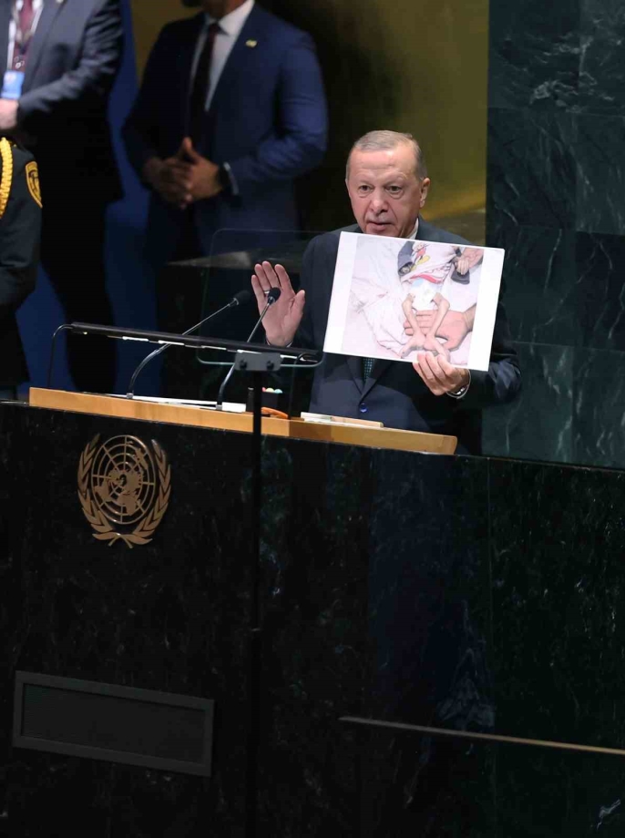 Konuşmasında duygusal anlar yaşayan Erdoğan, açlıktan ölmek üzere olan bir çocuğun fotoğrafını göstererek, "Çocukların açlıktan, ilaçsızlıktan öldüğü bir dünyada huzur olur mu?" diye sordu. Gazze’deki soykırımın medya ve sosyal medya aracılığıyla canlı olarak yayınlandığını belirterek, uluslararası kamuoyunu harekete geçmeye çağırdı. Erdoğan, Filistin Devlet Başkanı Mahmut Abbas’ın Genel Kurul’da bulunamamasından duyduğu üzüntüyü de dile getirdi.