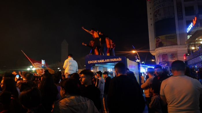 Galatasaray taraftarları hem şampiyonluğu hem de derbi galibiyetinin sevincini doyasıya kutladı. Maçın bitiş düdüğünün ardından sarı-kırmızılı taraftarlar Cumhuriyet caddesinde konvoy düzenleyip tezahüratlarla takımlarının başarısını kutladı.