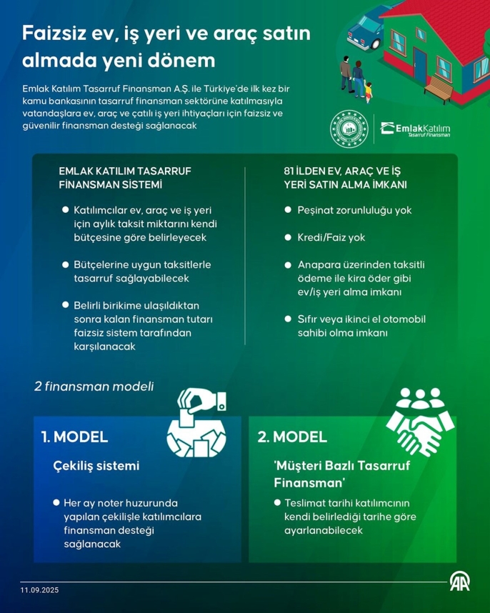 Devlet güvencesi altında sunulan bu faizsiz finansman sistemi, ailelerin kendi bütçelerine uygun ödeme planları oluşturmalarına olanak tanıyor. Sistem sadece ev alımını değil, araç ve iş yeri edinimini de kapsıyor. Emlak Katılım Tasarruf Finansman, vatandaşlara alternatif ödeme planlarıyla destek sağlayacak. Katılımcılar, bütçelerine uygun taksitlerle tasarruf ederek belirli bir birikime ulaştıktan sonra, kalan finansman tutarını faizsiz olarak Emlak Katılım Tasarruf Finansman’dan karşılayarak ev, araç veya iş yeri sahibi olabilecekler.