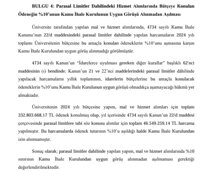 Raporda ayrıca, bazı daire başkanlıkları ve müdürlüklerde kadroların dolu olmasına rağmen aynı pozisyonlara başka personellerin görevlendirildiği tespit edildi. Bu görevlendirmelerde, 2547 sayılı Yükseköğretim Kanunu'nun 13/b-4 maddesine göre yapılan atamalarda, görev değişikliğinin hangi ihtiyaca binaen yapıldığına dair gerekçe gösterilmediği belirtildi. Sayıştay, bu tür görevlendirmelerde 'hizmete duyulan ihtiyaç' gerekçesinin soyut bırakıldığını ve işlemlerin daha objektif kriterlere dayandırılması gerektiğini ifade etti. Üniversitenin, elektrik dağıtım şirketinin sorumluluğunda olan trafo bakım ve onarım giderlerini kendi bütçesinden karşılaması da Elektrik Piyasası Tüketici Hizmetleri Yönetmeliği'ne aykırı bulundu. 4734 sayılı Kamu İhale Kanunu'nun 22/d maddesi kapsamında yapılan alımlarda ise bütçe ödeneğinin yüzde 10'unu aşan alımlarda Kamu İhale Kurulu'ndan uygun görüş alınmadan işlem yapıldığı ortaya çıktı. Mühendislik ve Mimarlık Fakültesi yapım işinde ise teknik zorunluluk olmamasına rağmen proje değişiklikleri ve iş artışları yapıldığı kaydedildi. Bu değişikliklerin idari tercihlerden kaynaklandığı ve Yapım İşleri Genel Şartnamesi'ne aykırı olduğu belirtildi. Sayıştay, üniversitenin mali disiplin ve yönetim süreçlerinin gözden geçirilmesi gerektiğini vurgulayarak, mali işlemlerde sorumluluk alanı dışına çıkılmaması, görevlendirmelerde objektif ve şeffaf kriterlere yer verilmesi ve ihale ile yapım işlerinde mevzuata tam uyum sağlanması çağrısında bulundu.