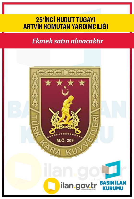 25'İNCİ HUDUT TUG.ARTVİN K.YRD.LIĞI MİLLİ SAVUNMA BAKANLIĞI MSB BAĞLILARI tarafından, PİŞİRİLMİŞ EKMEK mal alımı 4734 sayılı Kamu İhale Kanununun 19 uncu maddesine göre açık ihale usulü ile ihale edilecek olup, teklifler sadece elektronik ortamda EKAP üzerinden alınacaktır.