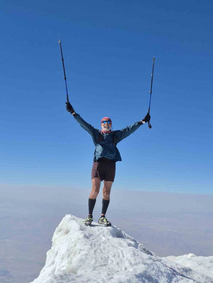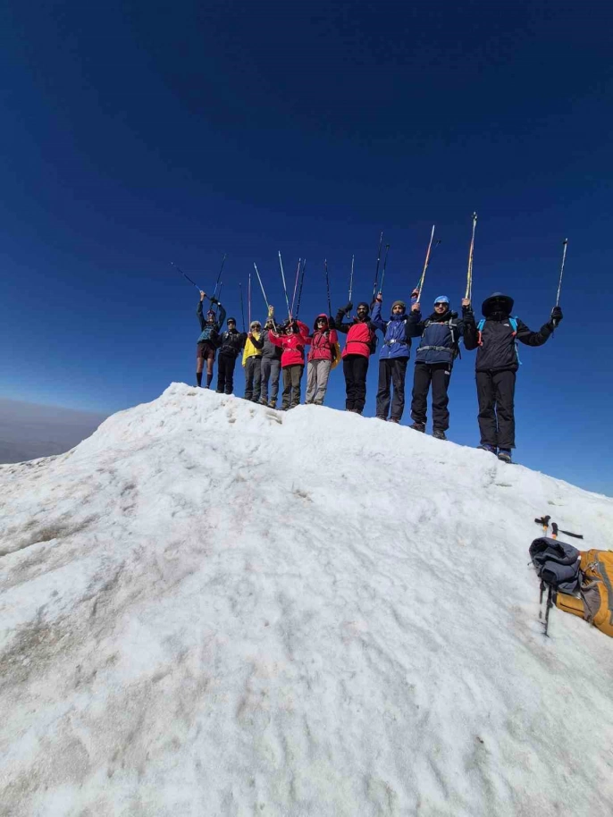 5 bin 137 metre yükseklikteki zirveye ulaşan tüm sporcular, 28 Ağustos’ta 2 bin 200 metreden yürüyüşe başladı ve 3 bin 200 metredeki kampta konakladı. 4 bin 200 metre ana kampa ulaştıktan sonra gece yarısı 00.30’da zirve tırmanışına başlayan ekip, sabah 06.30’da zirveye ulaştı. Zirvede Türk bayrağı ve 30 Ağustos Zafer Bayramı’na ilişkin pankart açarak günün anlam ve önemine dair konuşmalar yapıldı.