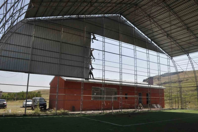 Akyaka Kaymakamı İsmail Demirtaş, sahada yapılan çalışmaları yerinde inceleyerek yetkililerden bilgi aldı. Yapılan çalışmalar kapsamında sahanın zemin kaplaması tamamen yenilenecek, yıpranmış brandalar ise kış şartlarına uygun sac kaplamalarla değiştirilecek.