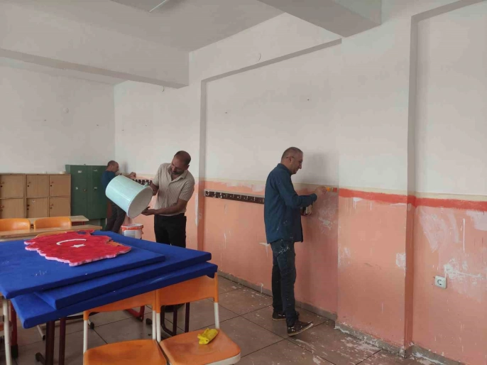23 Şubat İlkokulu’nda görev yapan öğretmenler de tatil günlerini okulda çalışarak geçiriyor. Fedakar öğretmenler, okulun hasarlı bölümlerini onarıyor ve dış cephesini boyuyor. Okul Müdürü Gürsoy Marancı, öğretmenlerle birlikte öğrencilerin daha güzel bir ortamda eğitim görmelerinin kendilerini mutlu ettiğini ve bu nedenle böyle bir çalışma yapmaya karar verdiklerini söyledi. Öğretmenlerin bu çalışma için tatillerinden feragat ettiğini belirten Marancı, '2025-2026 eğitim öğretim sezonuna daha iyi hazırlanmak için okulumuzda ufak tefek tadilatlar yapmaya karar verdik. Öğretmen arkadaşlarımızla amacımız, okulumuzu daha da güzelleştirmek ve eğitim öğretim döneminde çocuklarımız için daha güzel ve yaşanılabilir bir alan oluşturmak.' dedi.