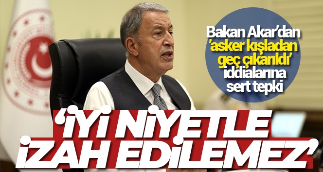 "Depremin ardından Mehmetçiğin kışlalardan geç çıkarıldığına" ilişkin söylemlere tepki gösteren Akar, "Bu tartışmalar gerçekleri yansıtmıyor. Milli Savunma Bakanlığı, Türk Silahlı Kuvvetleri unsurları askeriyle, siviliyle, işçisiyle, teknik personeli ile ilk andan itibaren seferber olmuş, milletinin yanına koşmuştur. Gece-gündüz demeden bu büyük deprem felaketinin açtığı yaraları sarmak için tüm gücüyle ilgili kurum ve kuruluşlarla koordineli bir şekilde gayretlerini aralıksız sürdürmektedir. Resmi kayıtlar ve bunlar arasında ordumuzun tarihçesi olan ceridelerdeki gerçekler var. Gerçekleri yansıtmayan bu yanlı iddialar iyi niyetle izah edilemez" ifadelerini kullandı.