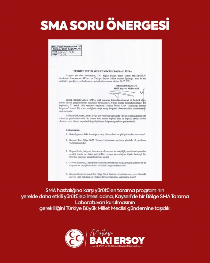 Milliyetçi Hareket Partisi (MHP) Kayseri Milletvekili Baki Ersoy, Spinal Müsküler Atrofi (SMA) hastalığıyla mücadelede önemli bir adım atılması çağrısında bulundu. Ersoy, Kayseri'de bir Bölge SMA Tarama Laboratuvarı kurulmasını talep ederek, SMA tarama programlarının etkinliğinin artırılmasını hedefliyor.