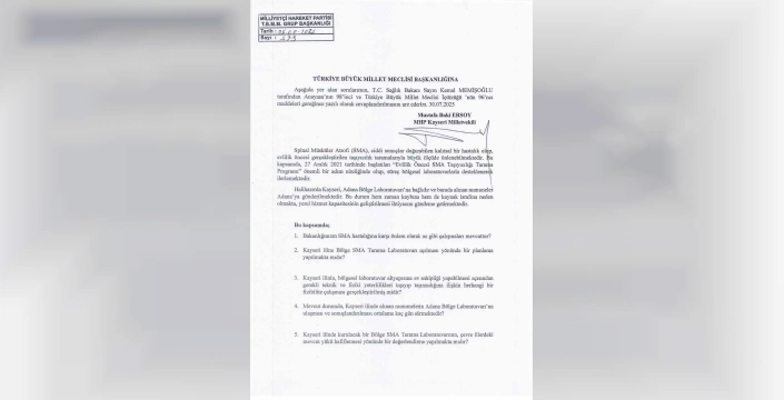 MHP Kayseri Milletvekili Baki Ersoy, Türkiye Büyük Millet Meclisi'nde yaptığı yazılı soru önergesiyle, Kayseri'nin bölgesel bir SMA tarama laboratuvarına ev sahipliği yapmasının önemini vurguladı. Ersoy, önergesinde Kayseri'nin mevcut laboratuvar kapasitesine dikkat çekerek, numune gönderim sürecinde yaşanan zaman kayıplarının önlenmesi ve yerel hizmet kalitesinin artırılmasının gerekliliğine işaret etti.