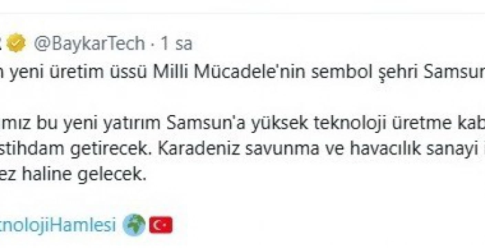 BAYKAR’ın yaptığı açıklamada ise yeni üretim üssünün Milli Mücadele’nin sembol şehri Samsun olacağı duyuruldu. Açıklamada, yapılacak yatırımın Samsun’a yüksek teknoloji üretme kabiliyeti ve nitelikli istihdam getireceği, Karadeniz bölgesinin ise savunma ve havacılık sanayisi için önemli bir merkez haline geleceği vurgulandı. Samsun’un bu yatırımla birlikte Karadeniz’de savunma ve havacılık sanayisi için stratejik bir merkez olması hedefleniyor.