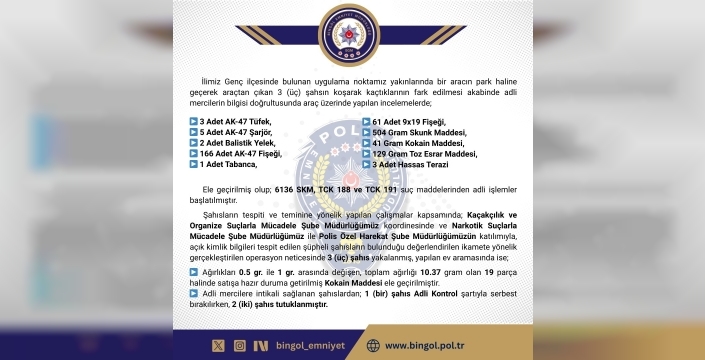 Araçta; 3 adet AK-47 tüfek, 5 adet AK-47 şarjör, 2 adet balistik yelek, 166 adet AK-47 fişeği, 1 adet tabanca, 61 adet 9x19 fişeği, 504 gram skunk maddesi, 41 gram kokain maddesi, 129 gram toz esrar maddesi ve 3 adet hassas terazi bulundu. Şüphelilerin ikametgahlarında yapılan aramalarda ise 10.37 gram kokain daha ele geçirildi.