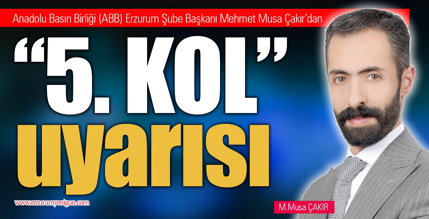 Sosyal medyadaki algı girişimlerine dönük yorumları ve açıklamalarıyla bilinen Anadolu Basın Birliği Erzurum Şube Başkanı Mehmet Musa Çakır, Türkiye’yi kontrol altında tutamayan küresel emperyalist güçlerin ülkede uzun bir süredir 5. Kol faaliyeti yürüttüklerinin altını çizdi. Sosyal medyada Türkiye aleyhinde dikkat çeken etkileşim ve paylaşımların da bu faaliyet kapsamında bulunduğuna dikkati çeken Çakır, “5. Kol faaliyetlerinin ana hedefi siyasal, sosyal ve ekonomik istikrarsızlık algısı oluşturup, toplumsal kaos oluşturmaktır. Şu anda Türkiye üzerinde denenen yöntem tam da budur” diye konuştu.