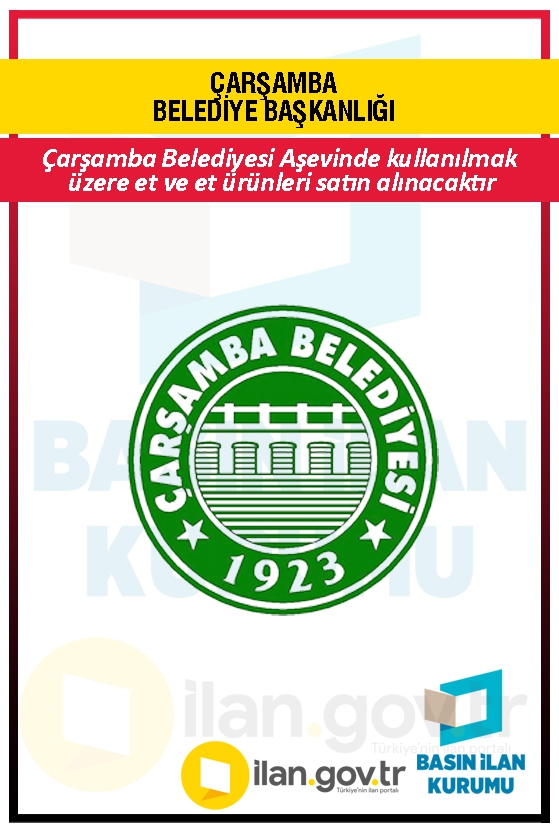 ÇARŞAMBA BELEDİYESİ ÖZEL KALEM MÜDÜRLÜĞÜ TARAFINDAN, Belediyemiz Aşevinde Kullanılmak Üzere Et ve Et Ürünleri Mal Alım İşi mal alımı 4734 sayılı Kamu İhale Kanununun 19 uncu maddesine göre açık ihale usulü ile ihale edilecek olup, teklifler sadece elektronik ortamda EKAP üzerinden alınacaktır.
