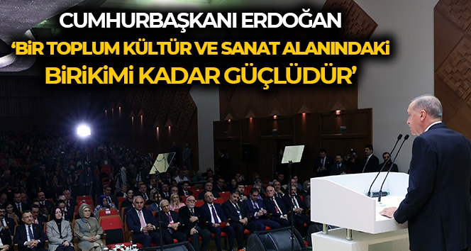 Kültür ve sanatın bir milleti ayakta tutan önemli sütunlar arasında geldiğini ifade eden Cumhurbaşkanı Erdoğan, bir toplumun kültür ve sanat alanındaki birikimi kadar güçlü olduğunu kaydetti. Savunmada, ekonomide ve diğer alanlarda elde edilen kazanımların kalıcılığının da kültür ve sanata bağlı olduğuna dikkat çeken Erdoğan, kültür ve sanat açısından zayıf toplumların saman alevi gibi sönüp gittiklerini söyledi. İnsanlık tarihine bakıldığında bunun sayısız örneğiyle karşılaşıldığını belirten Cumhurbaşkanı Erdoğan, "Bileğinin gücüyle kilometrelerce savaşmış komutanları bugün kimse hatırlamıyor. Nice güçlü ordunun bugün esamisi okunmuyor. Fakat sanatta çığır açmış, kendi özgün kimliklerini icra etmiş özgün toplumlar dimdik ayaktadır" dedi.