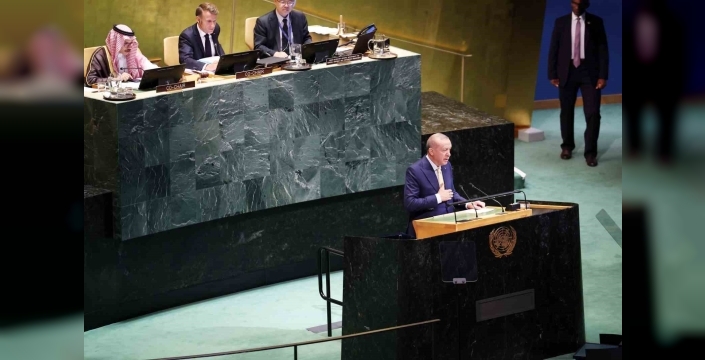 'Holokost zulmüyle kökü kazınmak istenen bir toplumu yöneten Netanyahu hükümeti, aynı toprağı, suyu, havayı, denizi paylaştığı binlerce yıllık komşularına soykırım uyduruyor' diyen Erdoğan, uluslararası toplumun hukuki ve vicdani sorumluluğunun, bu zulme karşı durmak olduğunu belirtti. İki devletli çözüm vizyonunu öldürmeyi amaçlayan işgal ve ilhak politikalarına izin verilmemesi gerektiğini vurgulayan Erdoğan, Filistin'in Birleşmiş Milletler'e tam üyeliğinin vaktinin geldiğini ifade etti. Türkiye'nin, 1967 sınırları temelinde, başkenti Doğu Kudüs olan Filistin Devleti kurulana kadar mücadeleye devam edeceğini sözlerine ekledi.