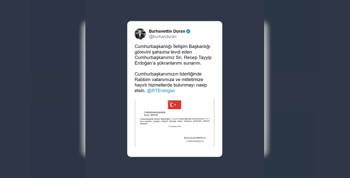 Atamanın ardından sosyal medya hesabından açıklamada bulunan Duran, 'Cumhurbaşkanlığı İletişim Başkanlığı görevini şahsıma tevdi eden Cumhurbaşkanımız Sn. Recep Tayyip Erdoğan’a şükranlarımı sunarım. Cumhurbaşkanımızın liderliğinde Rabbim vatanımıza ve milletimize hayırlı hizmetlerde bulunmayı nasip etsin' ifadelerini kullandı.