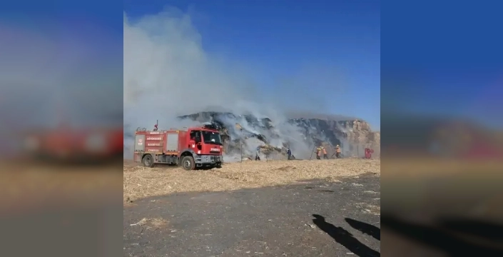 Mardin'in Derik ilçesinde, bir enerji şirketine ait alanda depolanan mısır balyaları bilinmeyen bir nedenle tutuşarak alev aldı.