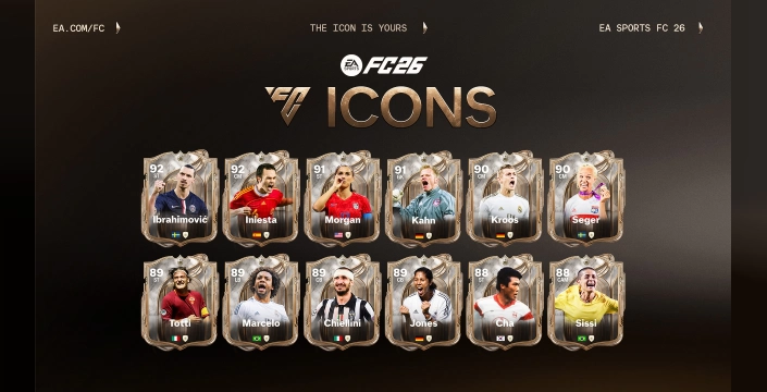 Modern futbolu şekillendiren 12 yeni ICON oyuncunun listesi şöyle: Zlatan Ibrahimović, Alex Morgan, Andrés Iniesta, Toni Kroos, Caroline Seger, Giorgio Chiellini, Sissi, Francesco Totti, Marcelo, Steffi Jones, Oliver Kahn ve Cha Bum-Kun. Zlatan Ibrahimović, FC 26 Ultimate Edition'ın kapak yıldızı olarak yer alıyor ve geri dönüşüyle ilgili heyecanını dile getirdi. Alex Morgan ise FC 26'da bir ICON olarak yer almaktan duyduğu onuru ifade etti ve gelecek nesillere ilham vermeyi umduğunu belirtti.