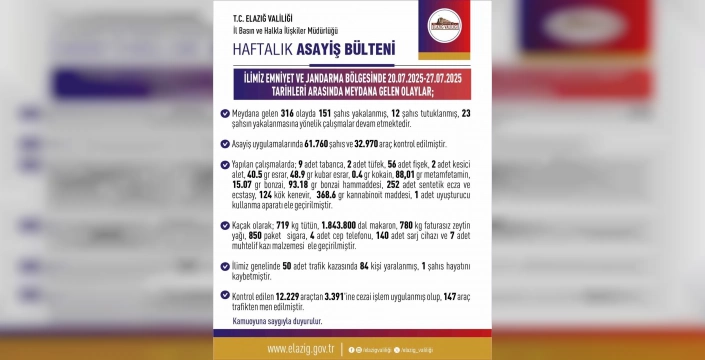 Doğu Anadolu Bölgesi'nin önemli şehirlerinden Elazığ'da, son bir haftada yaşanan asayiş olaylarında gözle görülür bir artış yaşandı. Elazığ Valiliği tarafından yapılan açıklamaya göre, 20-27 Temmuz tarihleri arasında toplam 316 asayiş olayı meydana geldi. Bu olaylar kapsamında, güvenlik güçlerimiz tarafından titiz bir çalışma yürütülerek 151 şahıs gözaltına alındı ve 12 şüpheli tutuklandı. Yakalama çalışmaları ise halen devam ediyor ve 23 şahsın yakalanması için yoğun çaba sarf ediliyor.