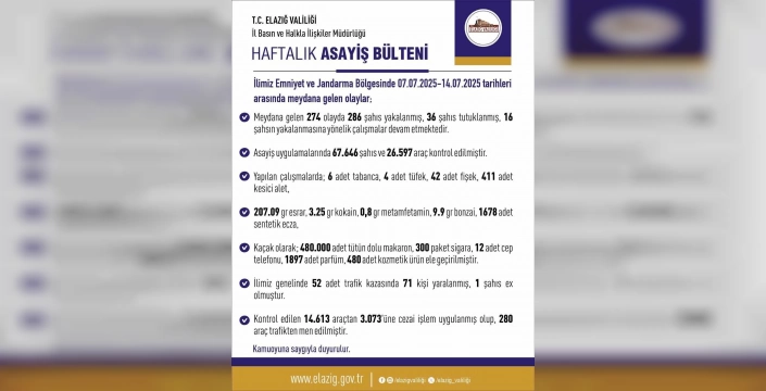 Elazığ'da 7-14 Temmuz 2025 tarihleri arasında gerçekleştirilen asayiş operasyonlarında önemli gelişmeler yaşandı. Güvenlik güçleri tarafından yürütülen çalışmalar sonucunda 274 olayda 286 kişi yakalandı ve bunlardan 36'sı tutuklandı. 16 şüphelinin yakalanması için çalışmalar devam ediyor.