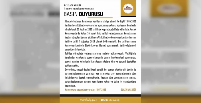 Valiliğin açıklamasına göre, 30 Haziran 2025 olarak belirlenen tahliye tarihi, konut teslimlerindeki gecikmeler nedeniyle 1 Ağustos 2025'e ertelendi. Konteyner kentlerde kalan 36 hak sahibi vatandaşımızın konutlarının teslim süreçlerinin devam etmesi nedeniyle bu uzatma kararı alındı. Bu süreçte, vatandaşlarımızın ihtiyaçları göz önünde bulundurularak, gerekli destekler sağlanmaya devam edilecektir. Devletimizin, vatandaşlarının yanında olduğunu bir kez daha gösteren bu anlayış, milli ve manevi değerlerimizle örtüşmektedir.