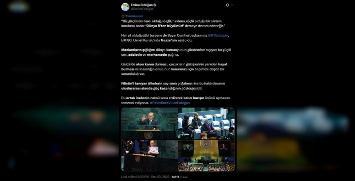 Paylaşımında, "Biz güçlünün haklı olduğu değil, haklının güçlü olduğu bir sistem kurulana kadar ’Dünya 5’ten büyüktür!’ demeye devam edeceğiz." ifadesini kullanan Emine Erdoğan, Gazze’deki kanın durması, çocukların gülüşlerinin yeniden hayat bulması ve insanlığın onurunun korunması için herkesin sorumluluk taşıdığını dile getirdi. Filistin’i tanıyan ülkelerin sayısının artmasının, bu davanın uluslararası alanda güçlendiğini gösterdiğini de sözlerine ekledi. Emine Erdoğan, paylaşımına Cumhurbaşkanı Erdoğan’ın BM Genel Kurulu’ndaki konuşma anlarına ait fotoğraflar da ekledi.