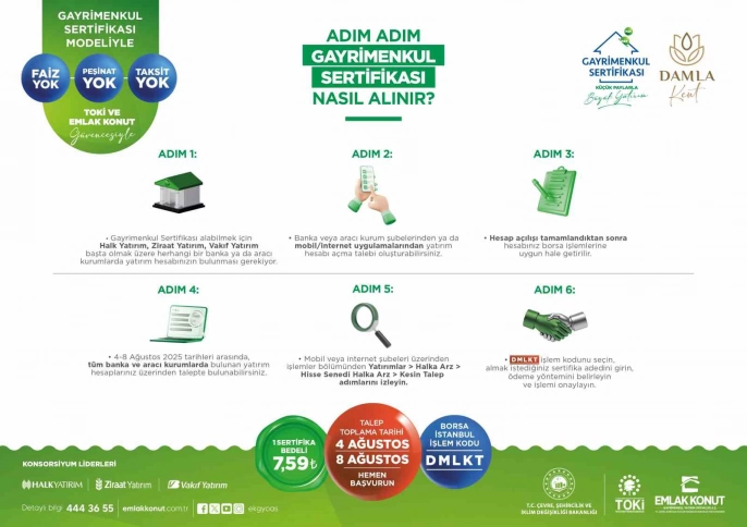 Emlak Konut GYO uzmanları, vatandaşların ‘Gayrimenkul Sertifikası nedir?’, ‘Nasıl alınır?’, ‘Nasıl yatırım yapılır?’ gibi sorularını yanıtlıyor. Ayrıca, Damla Kent projesinin detaylarını, sunulan daire tiplerini, sosyal donatı alanlarını ve yatırım fırsatlarını birebir anlatıyorlar. Vatandaşlar, VR gözlükler ile örnek daireleri sanal olarak gezebiliyor ve proje planlarını inceleyebiliyorlar. Yatırım hesabı açma konusunda da destek sağlanıyor. Talep toplama sürecinin 4-8 Ağustos tarihleri arasında Borsa İstanbul’da “DMLKT” işlem kodu ile yapılacağı belirtiliyor.