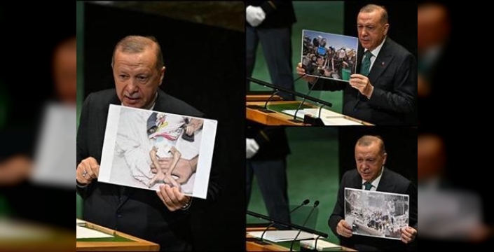 Cumhurbaşkanı Erdoğan, Birleşmiş Milletler 80. Genel Kurulu'nda yaptığı konuşma sırasında, İsrail'in Gazze Şeridi'nde iki yıldır işlediği soykırım ve etnik temizlik suçlarını belgeleyen fotoğrafları dünyaya gösterdi.
