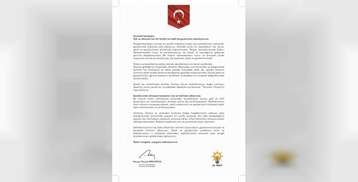 Cumhurbaşkanı Recep Tayyip Erdoğan, 'Terörsüz Türkiye' kapsamında şehit ve gazi ailelerine bir mektup yazdı. AK Parti teşkilatları, yaz boyunca şehit ve gazi ailelerini ziyaret ederek Cumhurbaşkanı Erdoğan'ın mektubunu iletecek.