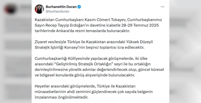 Cumhurbaşkanlığı İletişim Başkanı Burhanettin Duran'ın açıklamasına göre, Kazakistan Cumhurbaşkanı Kasım Cömert Tokayev, Cumhurbaşkanı Recep Tayyip Erdoğan'ın davetlisi olarak 28-29 Temmuz tarihlerinde Ankara'da olacak. Bu önemli ziyaret, iki ülke arasındaki stratejik işbirliğinin daha da güçlendirilmesi için büyük önem taşıyor.