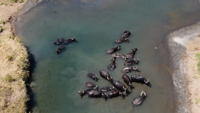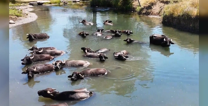 Erzincan’a birkaç kilometre uzaklıktaki Akyazı Mahallesi’nde mandaların doğal ortamda beslenmesi ve dere içinde geçirdikleri keyifli anlar, Tanzanya’nın Serengeti Milli Parkı’nı anımsatıyor. Sıcaktan bunalan mandalar saatlerce sudan çıkmıyor.