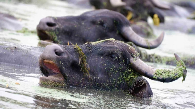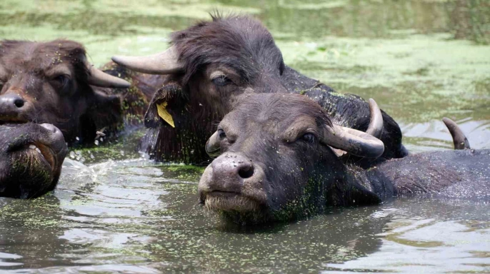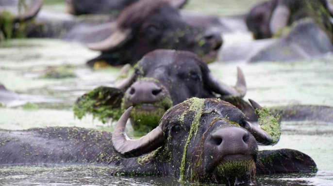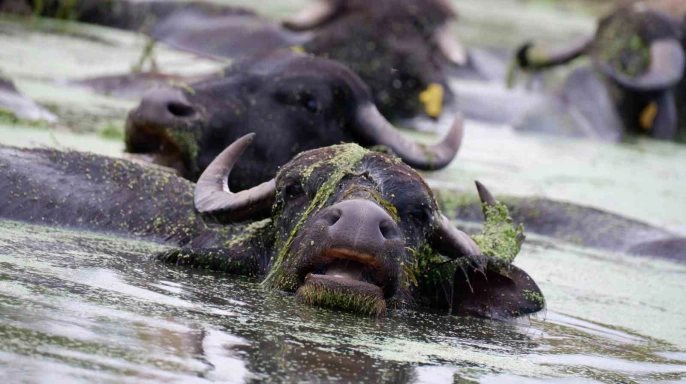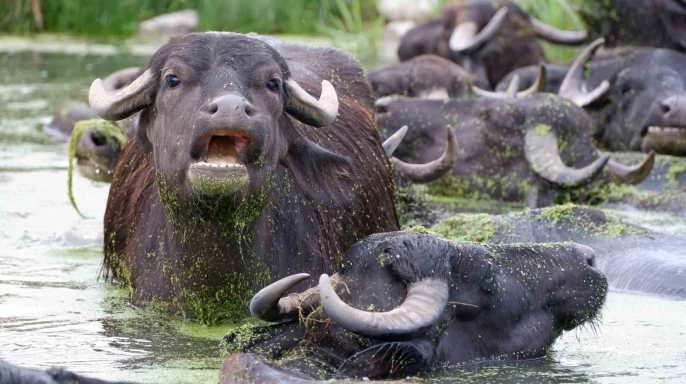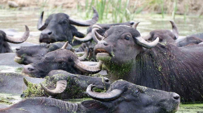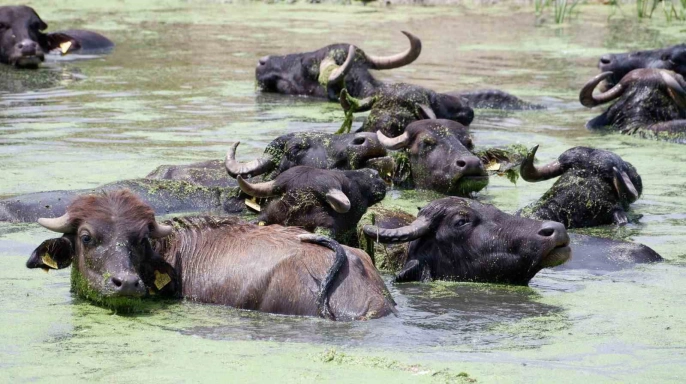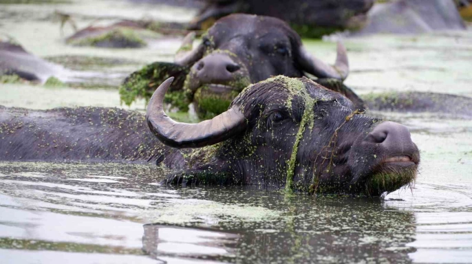 Erzurum’un Aziziye ilçesi Söğütlü köyünde bulunan mandaların serinlemek için dereye girmeleri, adeta Afrika’nın ünlü Serengeti Milli Parkı’nı hatırlatıyor. Köy, Erzurum kent merkezine yaklaşık 18 kilometre uzaklıkta yer almaktadır. Efsanelerle dolu balıklı gölü ve yetiştirdiği bol yeşilliklerle tanınan Söğütlü köyü, son zamanlarda yüzlerce mandasıyla da dikkat çekmektedir. Bu mandaların sütü, yoğurdu ve peyniri oldukça talep görmekte ve hemen tüketilmektedir. HAVALARIN SICAK GEÇMESİYLE BİRLİKTE MANDALARIN DEREYE AKIN ETMESİ GÖZLER ÖNÜNDE.
