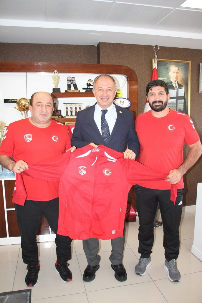 Milli takım teknik sorumlusu Nesrullah Baysal ve antrenör Ender Coşkun, Çakmur’a Güreş Milli Takımı forması hediye etti. U20 Takım Teknik Direktörü Nesrullah Baysal, yardımcı antrenörler Ender Coşkun, Abdulhamit Altun, Nazım Kara, masörler Osman Ok, Mehmet Özmüş ve Türkiye’nin olimpik güreş hakemlerinden Yusuf Sadri Kishalı ziyarette yer aldı. Samimi bir ortamda gerçekleşen ziyarette, Teknik Direktör Nesrullah Baysal ve Antrenör Ender Coşkun, İl Müdürü Levent Çakmur’a milli forma hediye etti.
