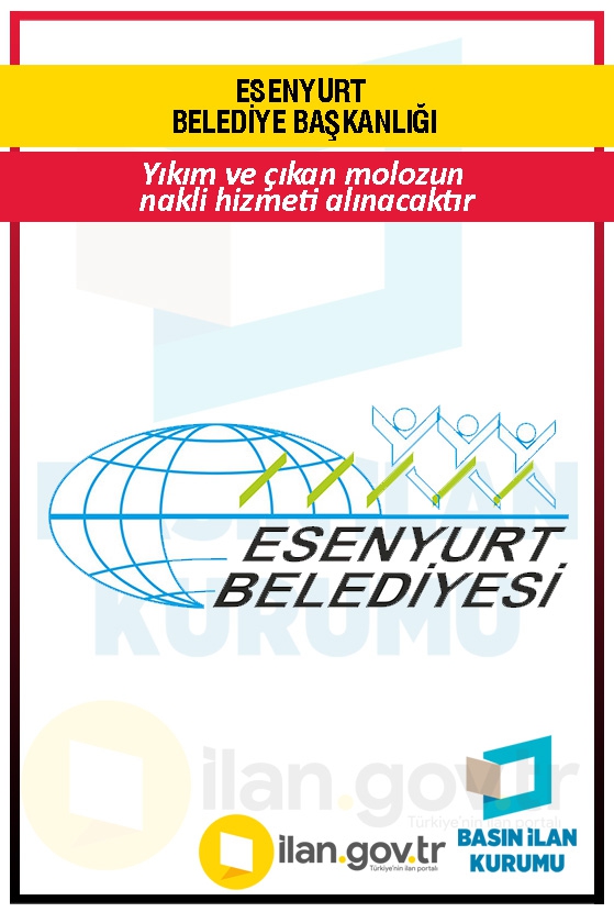 ESENYURT BELEDİYESİ YAPI KONTROL MÜDÜRLÜĞÜ tarafından, BELEDİYEMİZ SINIRLARI DAHİLİNDE 3194 SAYILI İMAR KANUNUNUN 32 MADDESİNE GÖRE RUHSATSIZ VE RUHSAT EKLERİNE AYKIRI YAPILAN YAPILARIN YIKIMI VE ÇIKAN MOLOZUN NAKLİ İŞİ hizmet alımı 4734 sayılı Kamu İhale Kanununun 19 uncu maddesine göre açık ihale usulü ile ihale edilecek olup, teklifler sadece elektronik ortamda EKAP üzerinden alınacaktır.