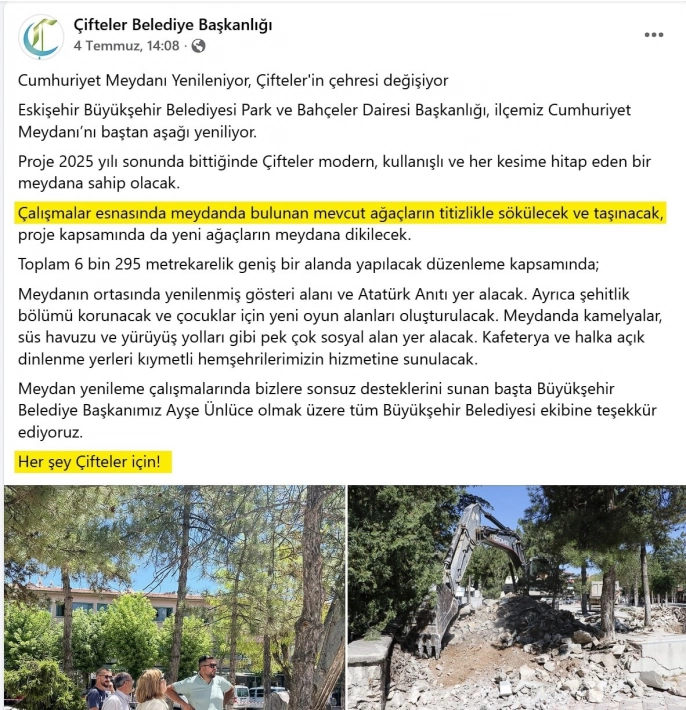 AK Parti Çifteler İlçe Başkanı Yakup Önür ise, ağaç kesimlerinin Çifteler halkını rahatsız ettiğini belirtti. Vatandaşların duyarlılığının önemli olduğunu vurgulayan Önür, mevcut meydanın herhangi bir sorunu olmadığını, yeni bir çalışma yapılacaksa bile yeşilin korunması gerektiğini ifade etti. Ortaya çıkan görüntüler ve vatandaşların tepkilerinin kendilerini derinden üzdüğünü belirten Önür, CHP'li belediyelerin bu yeşil kıyımını kabul etmediklerini ve süreci yakından takip edeceklerini açıkladı. Çifteler Belediyesi'nin 4 Temmuz tarihli sosyal medya paylaşımında, ağaçların 'titizlikle söküleceği ve taşınacağı' belirtilmişti, ancak gerçekleşen durumun bu paylaşımla örtüşmediği vurgulandı.