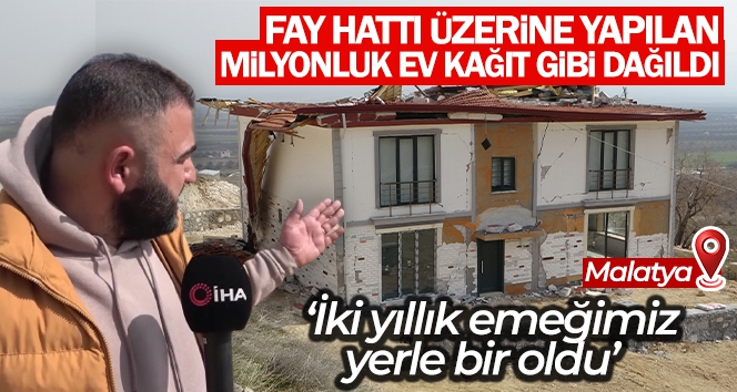 Kahramanmaraş merkezli 7,7 ila 7,6 büyüklüğündeki depremlerin vurduğu Malatya'nın Akçadağ ilçesinde fay hattı üzerine yapıldığı ortaya çıkan iki katlı milyonluk ev kağıt gibi dağıldı. Akçadağ ilçesine bağlı Başpınar Mahallesi Dikendede mevkiinde ailesiyle birlikte yaşayan 39 yaşındaki Soner Menge'ye ait yapımı bu yıl tamamlanan iki katlı milyonluk ev ile taştan yapılan havuz, Kahramanmaraş merkezli depremlerde kağıt gibi dağılarak kullanılmaz hale geldi.