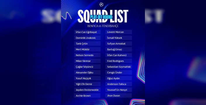 Fenerbahçe'nin Benfica maçı için açıklanan kadro şu isimlerden oluşuyor: İrfan Can Eğribayat, Dominik Livakovic, Tarık Çetin, Mert Müldür, Nelson Semedo, Milan Skriniar, Çağlar Söyüncü, Alexander Djiku, Yusuf Akçiçek, Yiğit Efe Demir, Jayden Oosterwolde, Archie Brown, Levent Mercan, İsmail Yüksek, Sofyan Amrabat, Bartuğ Elmaz, İrfan Can Kahveci, Fred, Sebastian Szymanski, Cengiz Ünder, Oğuz Aydın, Talisca, Youssef En-Nesyri, Jhon Duran. Teknik direktör Jorge Jesus, ilk maçta sakatlığı bulunan Cenk Tosun'u kadroya almamış ve yerine Cengiz Ünder'i dahil etmiş bulunuyor.