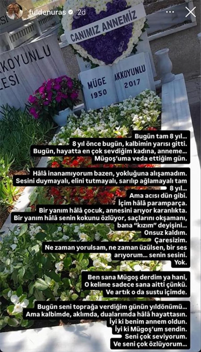 Fulden Uras'ın annesi Müge Akkoyunlu, 2017 yılında geçirdiği ağır bir enfeksiyon nedeniyle hayatını kaybetmişti. Geçen sekiz yılın ardından, şarkıcı annesinin ölüm yıl dönümünde duygusal bir paylaşım yaparak özlemini dile getirdi. Paylaşımında, annesinin sıcaklığını, sesini ve dokunuşunu ne kadar özlediğini anlattı.