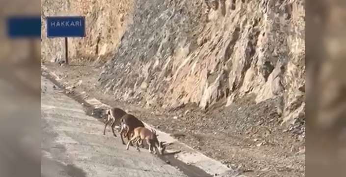 Sıcak havalarda su ihtiyaçlarını karşılamak için yerleşim alanlarına yakın bölgelere inen dağ keçileri, bu kez Hakkari - Van kara yolu üzerinde yolculuk eden vatandaşların dikkatini çekti. Keçiler, kalabalık bir şekilde kara yoluna inerek, sürücülerin ve yayaların ilgiyle izlemesi altında korkusuzca su içtiler.