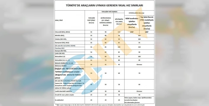 Türkiye'deki hız sınırları, yerleşim yeri içi, yerleşim yeri dışı ve otoyollar için ayrı ayrı belirleniyor. Azami hız sınırının üzerine yüzde 10 tolerans uygulanıyor. Örneğin, Yap-İşlet-Devret otoyollarında otomobiller için 140 kilometre/saat olan yasal hız sınırı, toleransla birlikte 154 kilometreye çıkıyor. Araç tiplerine göre de hız sınırları farklılık gösteriyor. Navigasyon uygulamaları, bulunduğunuz yoldaki hız sınırını kontrol etmenize yardımcı oluyor. Hız sınırlarının bazı noktalarda yükseltilmesi kararı alındı. Yolun yapısı, trafik yoğunluğu ve yaya hareketliliği gibi faktörler dikkate alınarak, uygun görülen yerlerde hız sınırları yeniden düzenlenecek. Kullanılmayan yaya geçitleri nedeniyle düşürülen hız sınırları da değerlendirilecek.