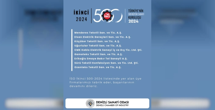 İstanbul Sanayi Odası (İSO), Mayıs ayında açıkladığı 'İSO Türkiye’nin 500 Büyük Sanayi Kuruluşu-2024' araştırmasının ardından, 'İSO İkinci 500' araştırmasının sonuçlarını açıkladı. Listede, bu yıl Denizli’den 9 firma yer aldı. Tekstil-konfeksiyon sektörü 6 firma ile kendine yer bulurken, kablo-bakır tel sektörü 3 firma ile listede öne çıktı.