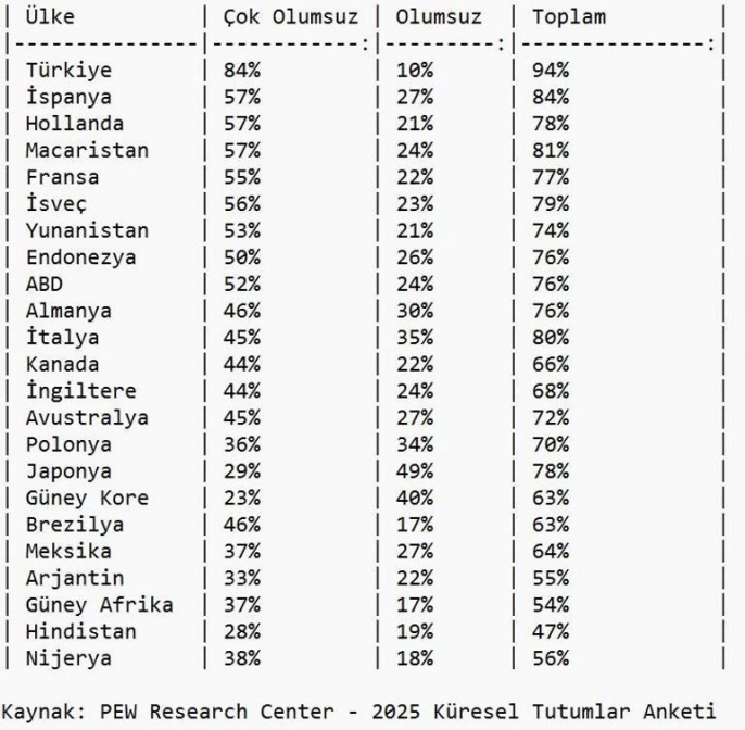 Afrika'da Nijerya ve Kenya yüzde 35 ile olumlu görüşler açısından öne çıktı. Avrupa'da ise en olumlu yaklaşım yüzde 36 ile Macaristan'dan geldi. Hindistan'da ise daha dengeli bir tablo var: yüzde 34 olumlu, yüzde 29 olumsuz görüş. ABD'de yüzde 24 çok olumsuz, yüzde 32 olumlu görüş kaydedildi. Kanada'da ise yüzde 44 oranında çok olumsuz görüş var. Latin Amerika'da Meksika yüzde 37, Brezilya yüzde 46 ve Arjantin yüzde 33 oranında çok olumsuz görüş bildirdi. Endonezya yüzde 50, Japonya yüzde 29 ve Güney Kore yüzde 23 oranında çok olumsuz görüş belirtti.