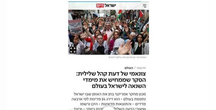 Israel Hayom gazetesinin haberine göre, Pew Research Center'ın Haziran 2025'te yaptığı anket, dünya genelinde İsrail'e yönelik nefreti ortaya koydu. Anket, 23 ülkede İsrail hakkındaki görüşleri ölçtü ve sonuçlar özellikle bazı ülkelerde güçlü bir olumsuz eğilimi gösterdi. Gazze saldırıları nedeniyle Tel Aviv ve Başbakan Binyamin Netanyahu'ya yönelik nefretin arttığı belirtiliyor.