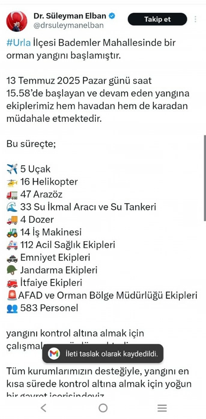 Vali Elban, tüm kurumların desteğiyle yangının en kısa sürede kontrol altına alınması için yoğun bir çaba gösterildiğini belirtti. Yangından etkilenen İzmirlilere geçmiş olsun dileklerini iletti.