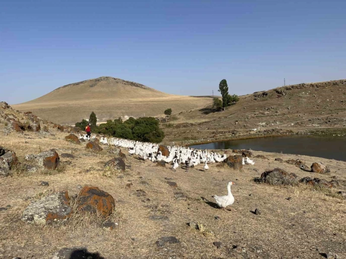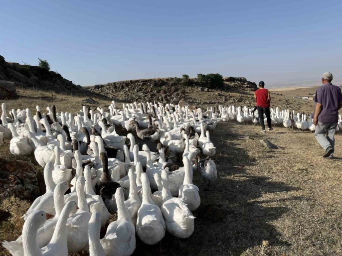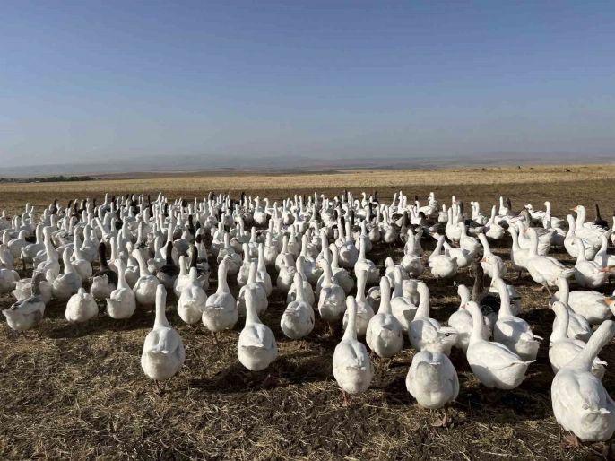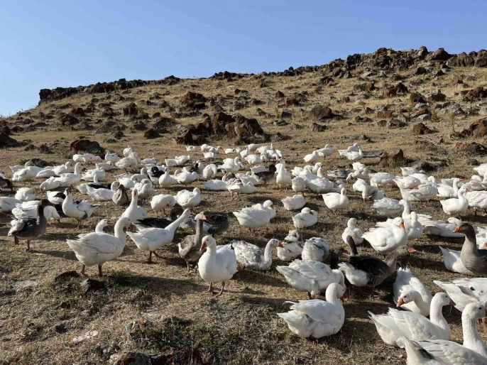 500 kazla başladığı yetiştiriciliğinde şu anda bin 400 kazı bulunan Bulut, kesim öncesi kazlarını besiye alıyor. Kazlarını günde birkaç kez göletlere getirerek yüzdürüyor. Bu yöntemle hem kazların su ihtiyacını karşılıyor hem de temizlenmelerini sağlıyor. 'Bu kazlar yaklaşık 15 günlük iken bana geldiler. Biliklerimiz elimde büyüdü. Bunların bir büyüme süreçleri vardı. Büyüdüler kesim zamanı yetişmesi gerekiyor. En iyi şekilde besilerini yapıyoruz. Hem merada yayılımı sağlıyoruz hem de akşamları arpa ile besliyoruz. Bunların kesim zamanı geldikten sonra bir kısmını keseceğiz. Bir kısmı da kedimize damızlık olarak ayıracağız. Çoğunluğunu satacağız, geçimimizi bu şekilde sağlıyoruz.' diye konuştu.