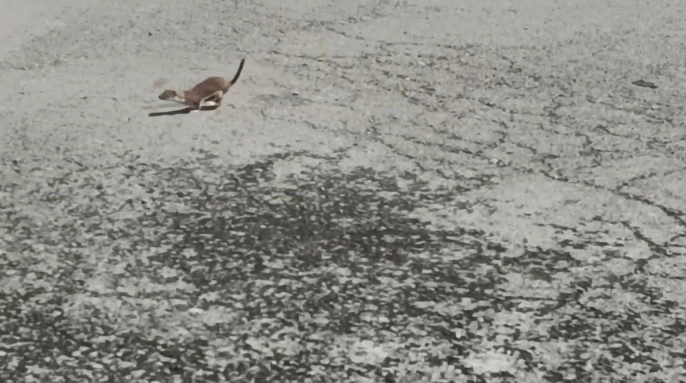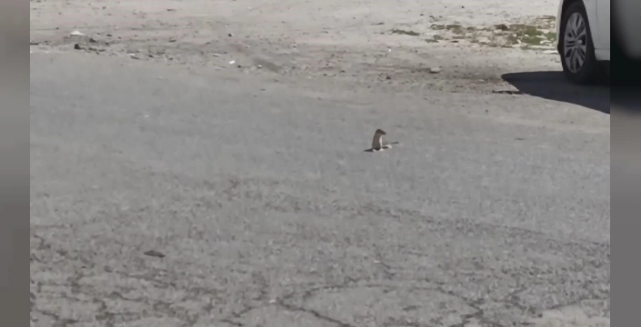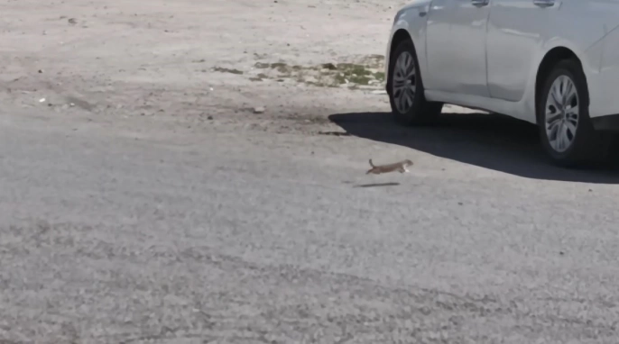 Cadde üzerinde dolaşan gelincik, bir vatandaş tarafından cep telefonuyla kaydedildi. Park halindeki araçların altına saklanan ve cadde sakinleşince ortaya çıkan hayvan, bir süre araçların altında gezindikten sonra caddeye çıktı ve koşarak ortadan kayboldu.