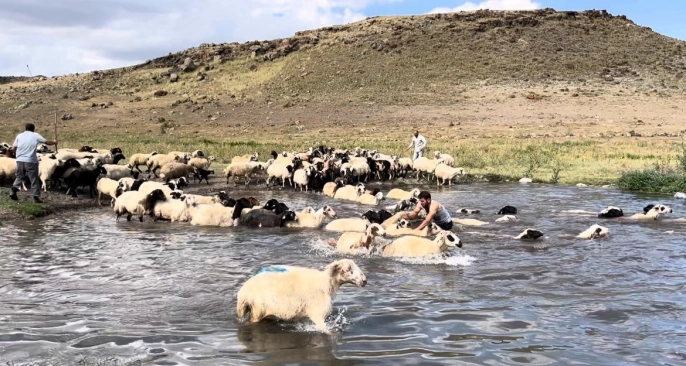 Hava sıcaklıklarının 34 dereceyi bulduğu Kars’ta, köylüler yaklaşık 400 koyununu serinletmek için günde en az üç defa derelere götürüyor. Akyaka’nın İncedere köyünde yaşayan Oktay Keyik, yaklaşık 400 küçükbaş hayvanını dereye getirdiğini belirterek, 'Bu sene çok sıcak, aşırı derece de sıcak, koyunları yıkamaya getirdik. Koyunları yıkadıktan sonra kendimiz de bu suda çimeceğiz, yüzeceğiz' dedi.