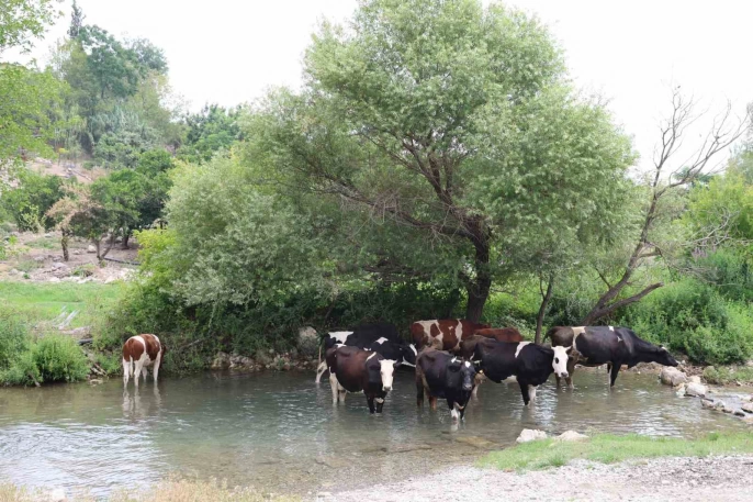 Kozan ilçesine bağlı Alapınar Mahallesi'nde ise büyükbaş hayvanlar, bunaltıcı sıcaklıktan kurtulmak için akarsuya girerek serinlemeye çalıştılar. Bu durum, sıcakların hayvanları da etkilediğini gözler önüne serdi.