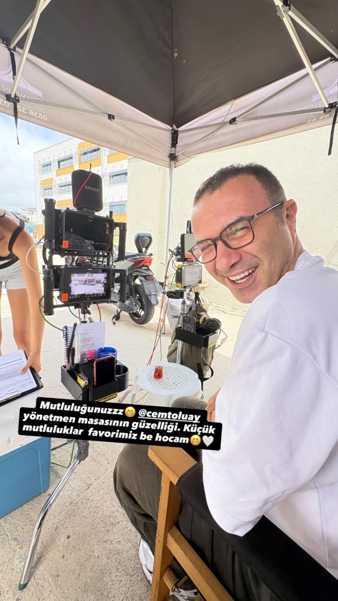 Merve Dizdar, dizinin setinden keyifli anlarını sosyal medya hesabından takipçileriyle paylaştı. Dizinin yönetmenlerinden Cem Toluay ile çekilmiş bir fotoğrafını yayınlayan Dizdar, 'Mutluluğunuz Cem Toluay. Yönetmen masasının güzelliği. Küçük mutluluklar favorimiz hocam.' ifadelerini kullandı.
