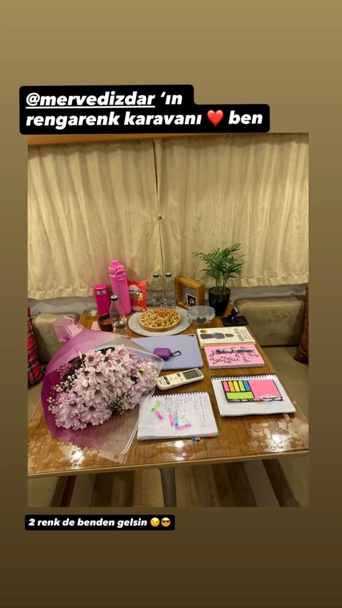 Daha sonra karavanında eşiyle birlikte çekilmiş bir fotoğrafını paylaşan ünlü oyuncu, 'Küçük mutluluklar en sevdiğimiz.' notunu düştü. Bu paylaşım, Merve Dizdar'ın eşi Cihan Ayger'den de yanıt aldı. Ayger, eşinin karavanından bir fotoğraf paylaşarak, 'Merve Dizdar'ın rengarenk karavanı kalp ben. İki renk de benden gelsin.' dedi.